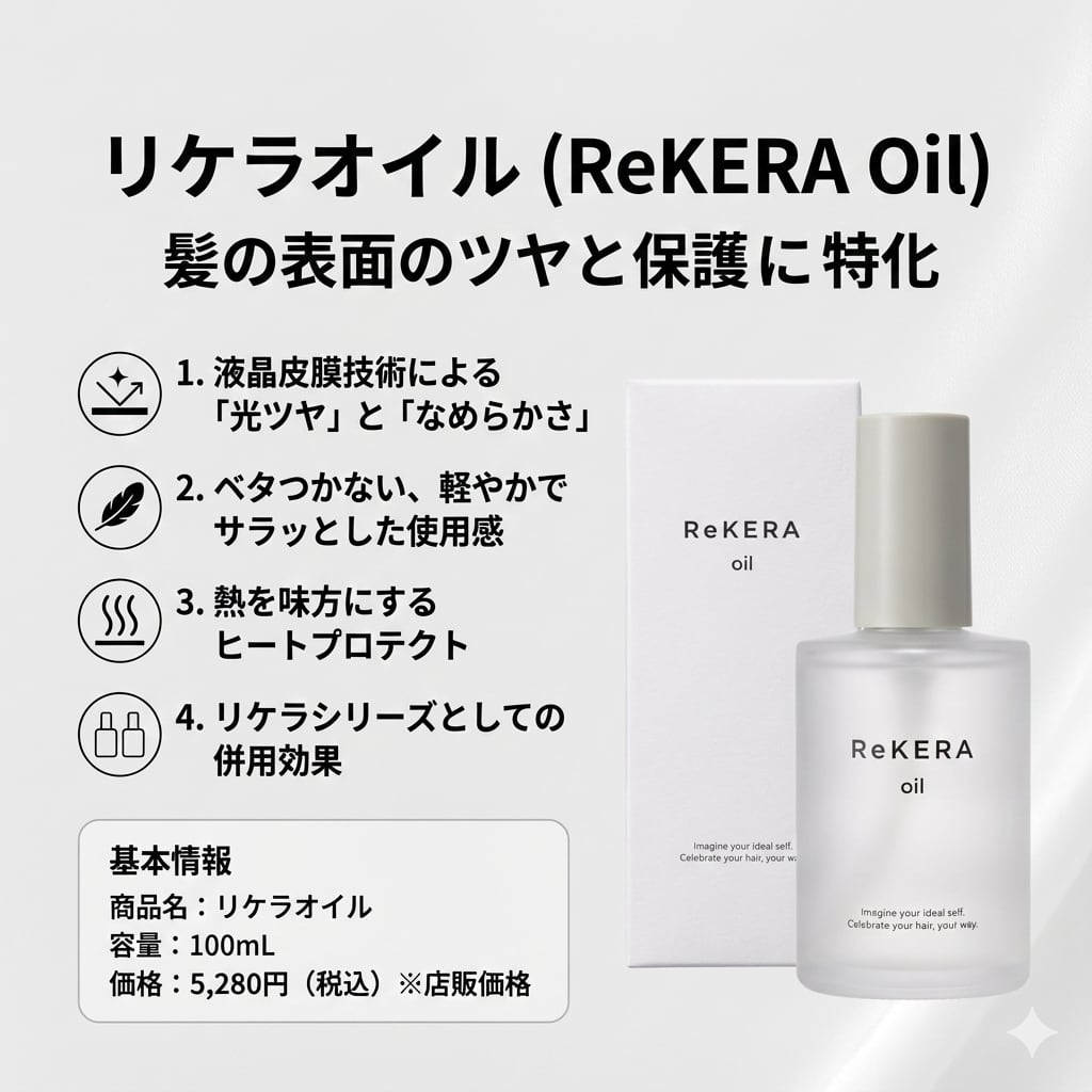 リケラミスト・エマルジョン(内部補修) と リケラオイル(外部保護・ツヤ) を併用することで、髪の内側と外側の両方から徹底的なケアが可能です。